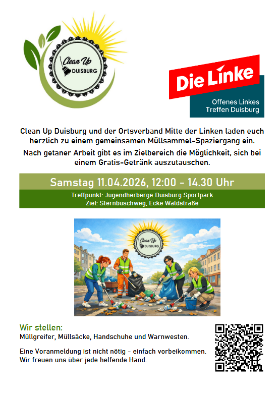 Clean Up Duisburg und der Ortsverband Mitte der Linken laden euch herzlich zu einem gemeinsamen Müllsammel-Spaziergang ein.